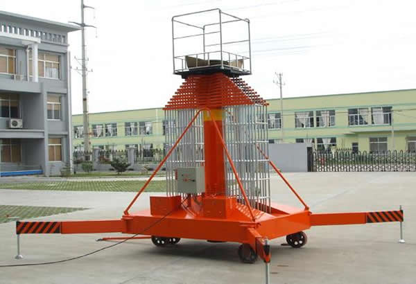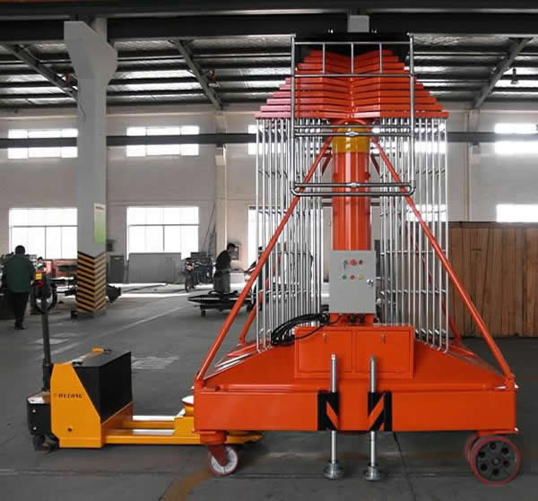 套缸式升降平臺具有設(shè)計(jì)新穎,體積小,外型美觀,操作維修方便,升降平穩(wěn)等優(yōu)點(diǎn)。整機(jī)由平臺、伸縮油缸、單梯式或雙梯式防轉(zhuǎn)機(jī)構(gòu)、底盤油箱、支腿、行走輪等組成。平臺由伸縮油缸直接頂升,當(dāng)啟動電機(jī)時(shí),由電機(jī)帶動齒輪泵供油,油液經(jīng)單向閥及電磁通道輸入油缸,伸縮油缸則逐節(jié)上升,當(dāng)平臺升到最大高度時(shí),系統(tǒng)壓力也就達(dá)到了額定工作壓力。